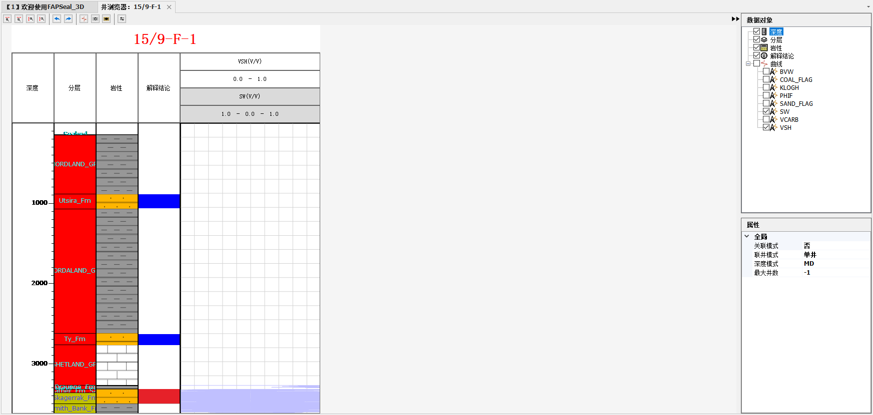 井浏览器加载后,数据对象会加载当前模块的数据对象,井浏览器数据对象包括深度,分层,岩性,解释结论,井曲线等,可对道对象进行显示和隐藏。