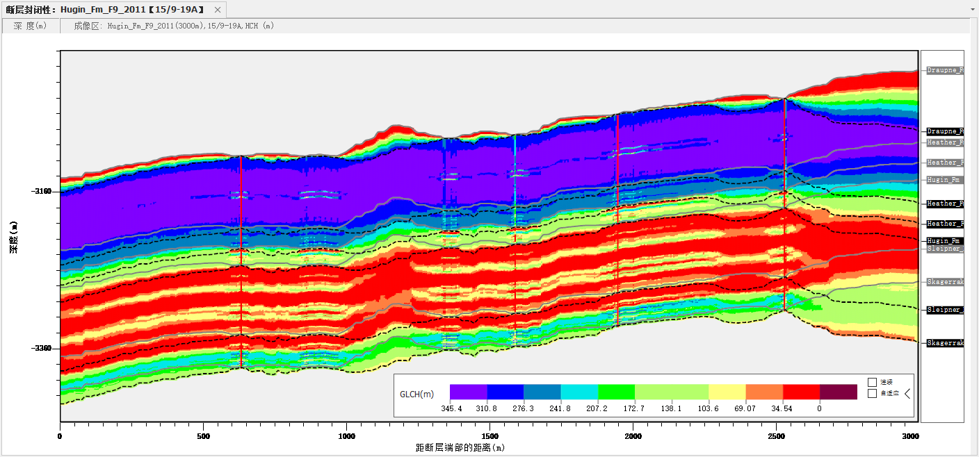 鼠标滑过成图区,会显示当前位置的深度、断距和断层渗透率值,不同的颜色代表不同的值。颜色和值的对应关系,可以点击菜单栏图例设置中的色标(横向)或者色标(纵向),具体操作参考图例设置。